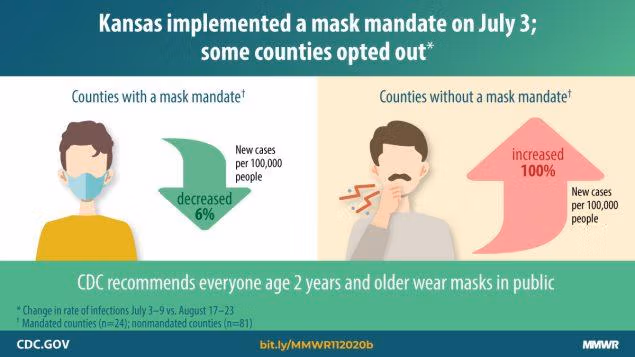 Den 27. november 2020, CDC frigivet en maskeundersøgelse kaldet "Trends i COVID-19-forekomst på amtsniveau i amter med og uden maskemandat - Kansas, 1. juni – 23. august 2020." Guvernøren i Kansas udstedte en bekendtgørelse, der krævede at bære masker i offentlige rum, med virkning fra den 3. juli 2020, som var underlagt amtsmyndighedernes fravalg. Undersøgelsen rapporterede, at "efter 3. juli faldt forekomsten af COVID-19 i 24 amter med maskemandater, men fortsatte med at stige i 81 amter uden maskemandater."