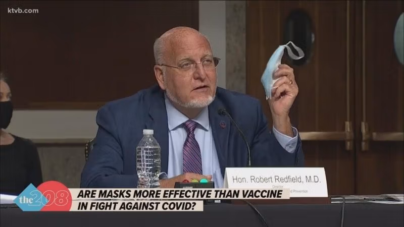 Den 16. september 2020 talte Dr. Redfield til en senatskomité. Mens han holdt en engangs kirurgisk maske (nedenfor), han sagde det her: