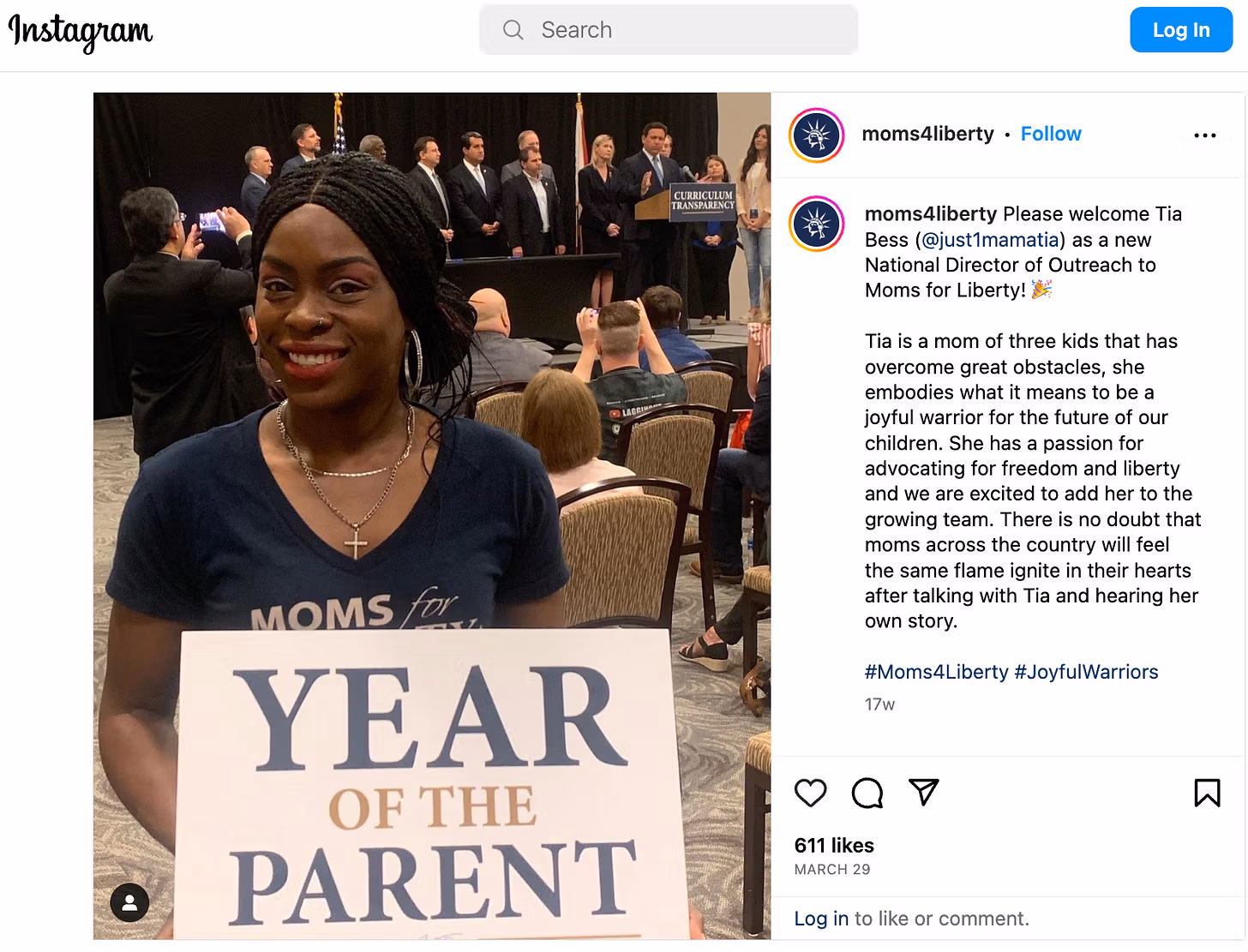 "Vi er Joyful Warriors. Under covid var jeg så frustreret over den måde, at vores børn blev såret af så mange dårlige beslutninger. Og jeg var meget vred. Og så besluttede vi at danne Moms for Liberty, og jeg måtte tage en beslutning om, hvordan jeg ville udføre dette arbejde. Jeg ønskede ikke at være vred hele tiden, eller at mine børn skulle vokse op og se mig være vred. Så jeg besluttede, at jeg ville kæmpe som helvede for Amerikas fremtid med et smil på læben, fordi vores børn ser på".