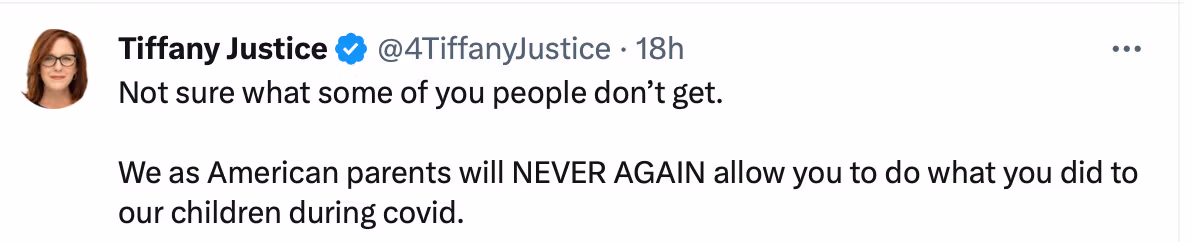 Jeg har aldrig mødt Tiffany personligt. Vi har talt i telefon inden for de sidste 2 1/2 år, måske 5 gange. Jeg har været på hendes podcast Joyful Warriors med min mand. Vi mailer hinanden. Vi skriver nogle gange. Jeg har aldrig talt til et Moms for Liberty-arrangement. Jeg er ikke medlem. Jeg har ikke givet dem nogen penge eller fået nogen penge fra dem. Jeg har aldrig købt en t-shirt.